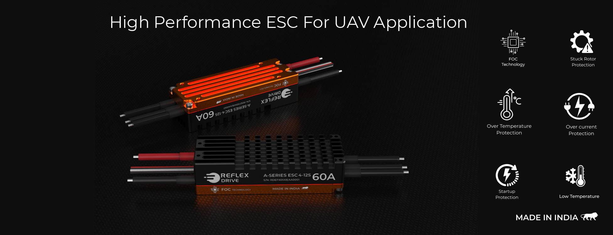 This ultra-lightweight, Made-in-India 2 kW peak FOC ESC weighs only 28 grams (without enclosure) and is optimized for UAV propulsion systems. It delivers precise and efficient motor control using advanced Field Oriented Control (FOC) technology.