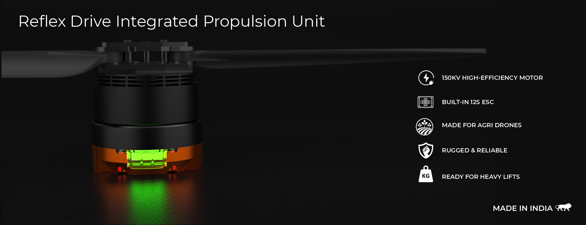 The RD IPU X6 6218 150KV is a high-performance Integrated Propulsion Unit (IPU) specifically designed for agricultural drone applications. This all-in-one solution features a fully enclosed Electronic Speed Controller (ESC), ensuring optimal protection and reliability in demanding environments. Made in India, the RD IPU X6 combines advanced propulsion technology with a robust design, making it ideal for precision agriculture, crop monitoring, and spraying tasks.