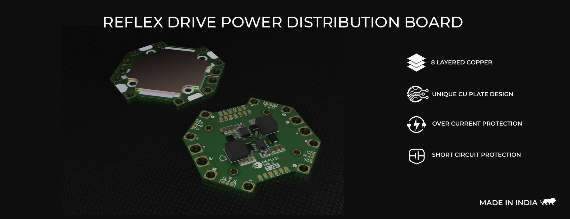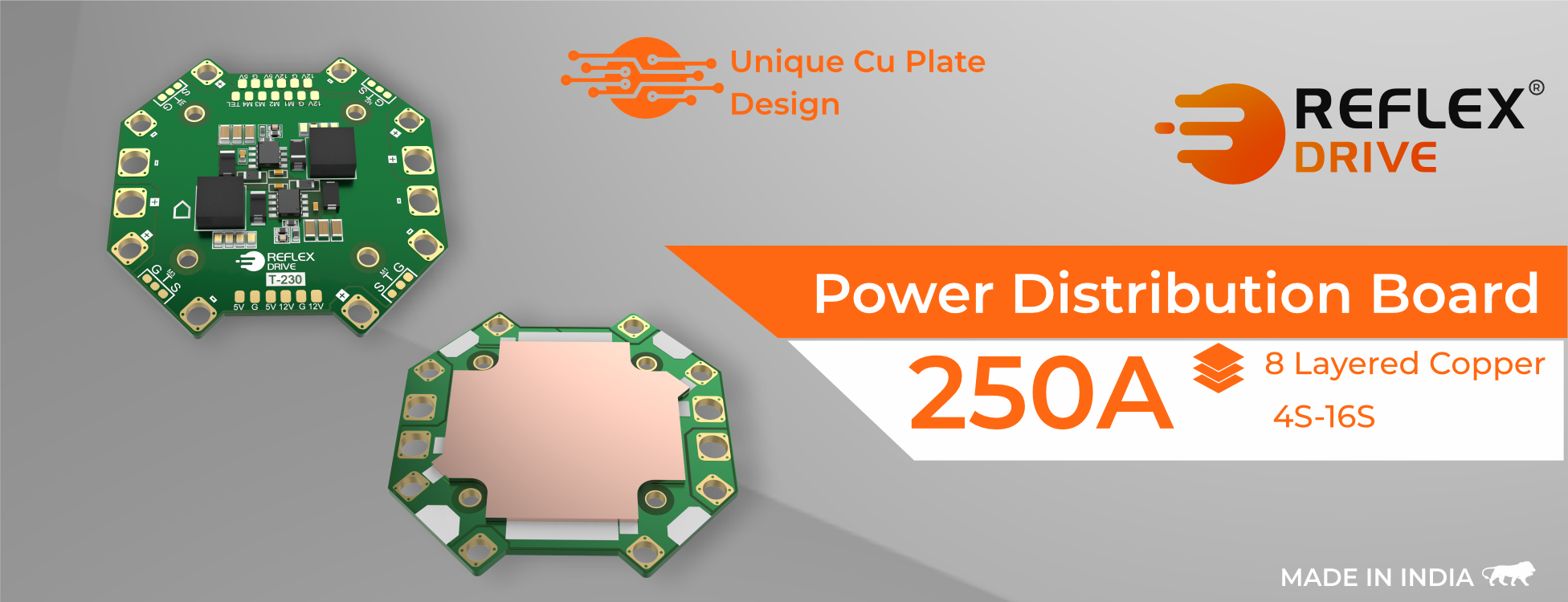 RD’s Power Distribution Board, the PDB 250A, is designed for high-voltage and high-current applications. It consists of 8 layers of heavy copper to sustain maximum current demand while minimizing heat dissipation, thereby protecting sensitive circuitry. Made in India, this PDB can handle up to 62A of continuous current to each ESC leg. It also features 12V/3A and 5V/3A regulators with support for up to 16S input. A unique copper plate design is optimized for both thermal conductivity and electrical efficiency.